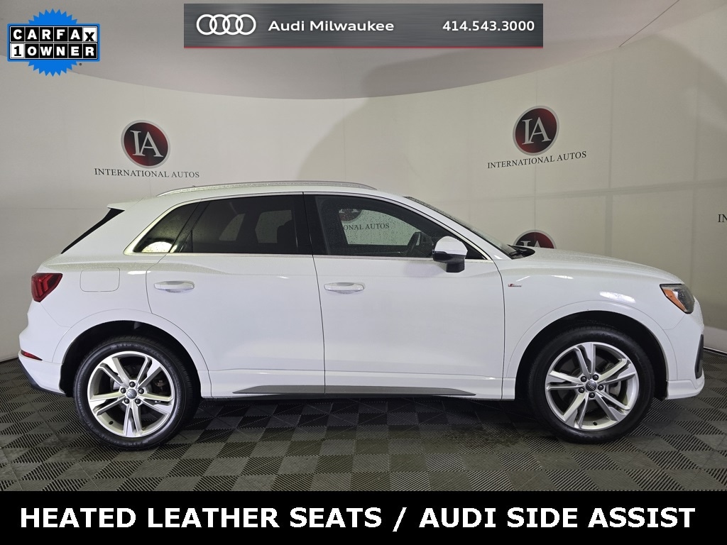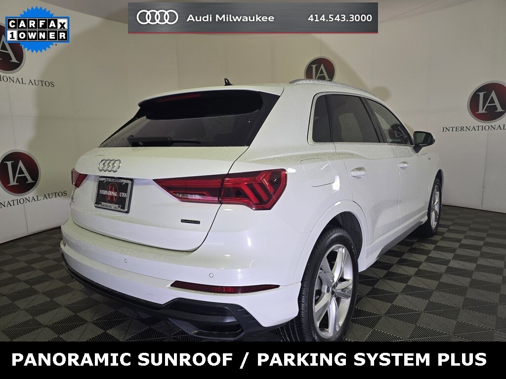 CARFAX One-Owner. Glacier White Metallic 2021 Audi Q3 Premium S Line quattro quattro 8-Speed Automatic with Tiptronic 2.0L 4-Cylinder TFSI 10 Speakers, 19" Wheel Package, ABS brakes, Alarm w/Motion Sensor, Alloy wheels, Audi Advanced Key, Audi Beam-Rings, Audi Parking System Plus, Audi Side Assist, Audi smartphone interface (Apple CarPlay/Android Auto), Auto High-beam Headlights, Automatic temperature control, Convenience Package, Exterior Parking Camera Rear, Frameless Auto-Dimming Interior Mirror w/Compass, Front Bucket Seats, Heated Front Bucket Seats, Heated Power-Folding Exterior Mirrors, Leather Seating Surfaces, LED Interior Lighting Package, Outside temperature display, Power driver seat, Power Liftgate, Power moonroof, Rain sensing wipers, SiriusXM All Access Service, Speed control, Wheels: 19" 5-Twin-Arm Design.