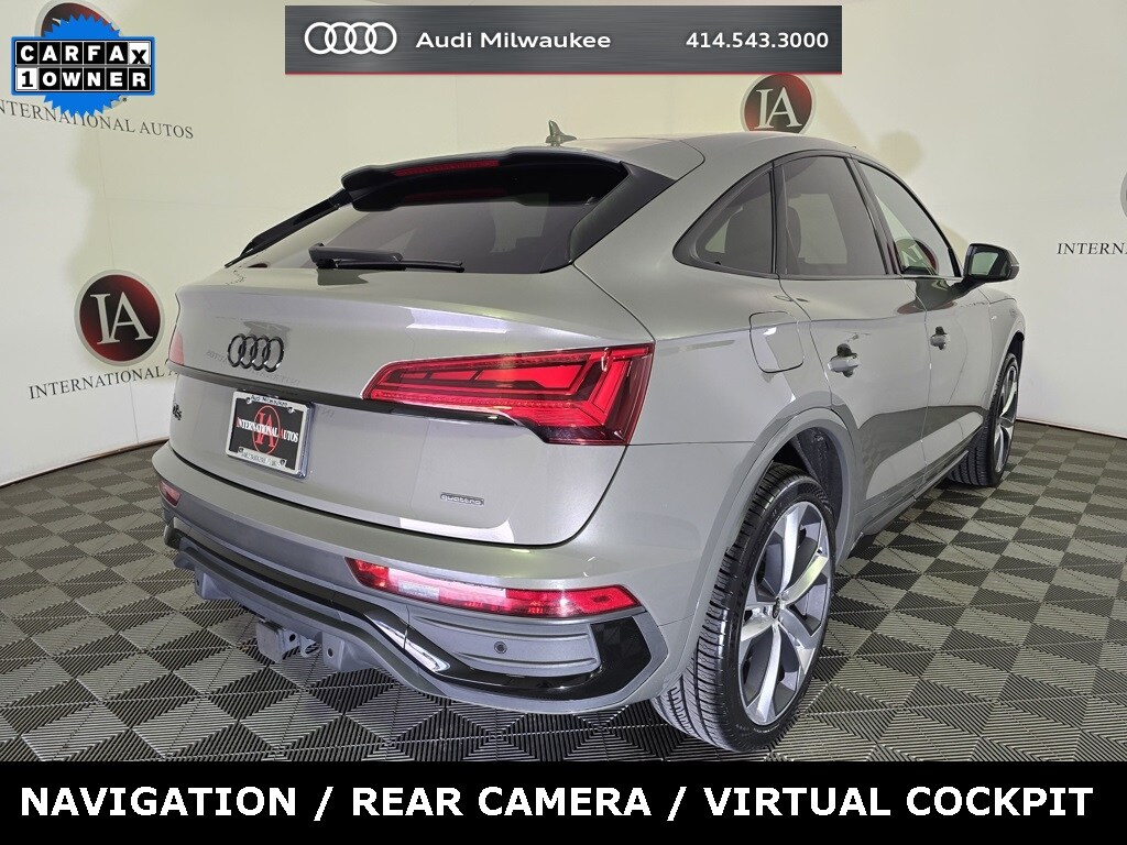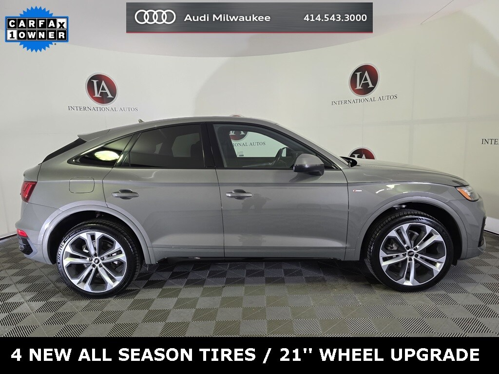CARFAX One-Owner. Clean CARFAX. Chronos Gray Metallic 2023 Audi Q5 Sportback 45 S line Premium Plus quattro quattro 7-Speed Automatic S tronic 2.0L Turbocharged ABS brakes, Alloy wheels, Audi Active Lane Assist, Audi Advanced Key, Audi Connect PLUS, Audi Virtual Cockpit Plus, Auto High-beam Headlights, Bang & Olufsen Sound System w/3D Sound, Black Audi Rings & Badges, Black Exterior Trim, Black Optic Sport Package, Compass, Convenience Package, Electronic Stability Control, Exterior Parking Camera Rear, Front dual zone A/C, Hands-On Detection Steering Wheel, Heated 8-Way Power Front Bucket Sport Seats, Heated door mirrors, Heated front seats, Heated Steering Wheel, Illuminated entry, Leather Seating Surfaces, Leatherette Covered Center Console & Door Armrests, Low tire pressure warning, MMI Navigation Plus, Navigation Package, Power Adjustable Steering Column, Power Liftgate, Power moonroof: Panoramic, Premium Plus Package, Rain sensing wipers, Remote keyless entry, Sport Suspension, Top View Camera System, Traction control, Traffic Jam Assist, Trailer Hitch, Wheels: 21" 5-Double-Spoke Module Design Bi-Color.